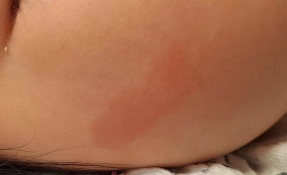 1歳0ヶ月の子供が、朝起きたら写真のような赤みが頬にできていました。大きさは、大人の小指ほどの太さ、指先から第2関節ほどの長さです。腫れてはおらず痒みもないようです。