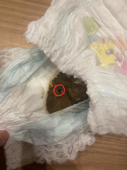 こんばんは。生後10ヶ月の娘ですが、今日二度あった排便の一部が黒いです。海苔の佃煮のような感じです。ですがごく一部で全体的には茶色です。離乳食の影響もあるのでしょうか?様子を見て大丈夫ですか?