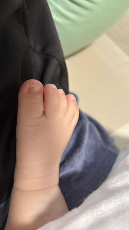 お子さんがご自身でたくさん動くようになると、足の爪にも負担がかかることはよくあります。内出血のようになったり、爪が剥がれてしまったりするお子さんもいらっしゃいます。お子さんのご様子で他に気になることがないのでしたら、おそらくお子さんの爪に一時的に負荷がかかったことによるものではないかと思いますが、どんどん増えてくる、お子さんが気になさるご様子がある、他にお子さんのご様子で気になることがあるなどの場合には、小児科か皮膚科でご相談なさってくださいね。