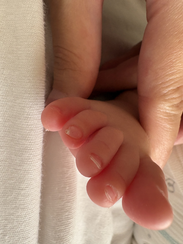 2ヶ月の赤ちゃんですが、足の薬指の端のほうが変だなとは思っていたのですが、他の爪は切ることがあるのにこの爪はあまり切ってないとこに気がつきました。