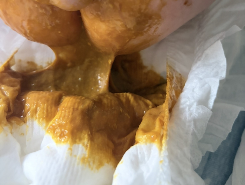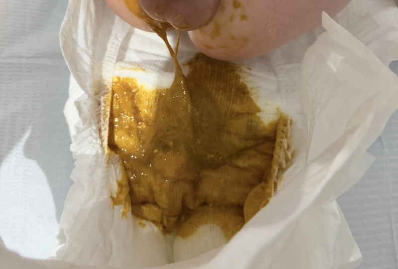 ここ1週間に数回ほど写真のような粘性の強いうんちが出ています。粘性便とオナラはともに硫黄臭がしています。本人は特にぐったりしている様子や哺乳量が減っているわけではありません。なかなか寝付けずぐずっている様子です。