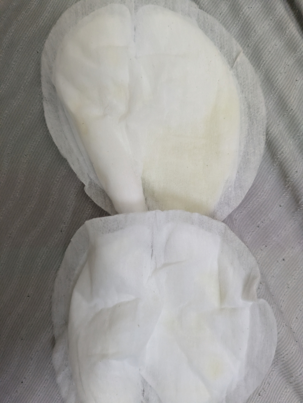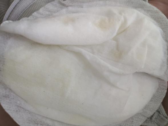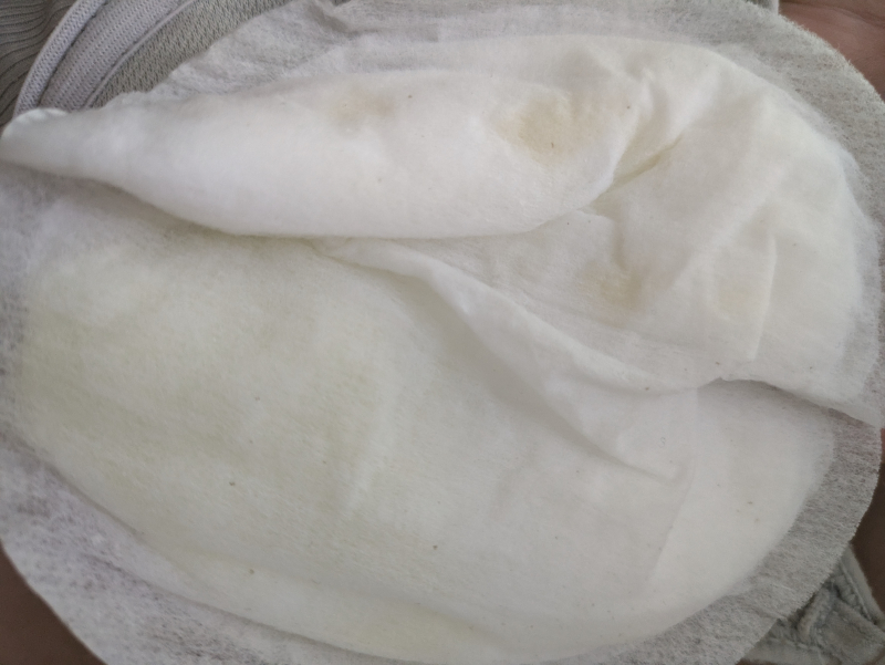 写真のパッドに染みついた母乳は、授乳前に出たものと授乳後に自分で出して確認したものです。