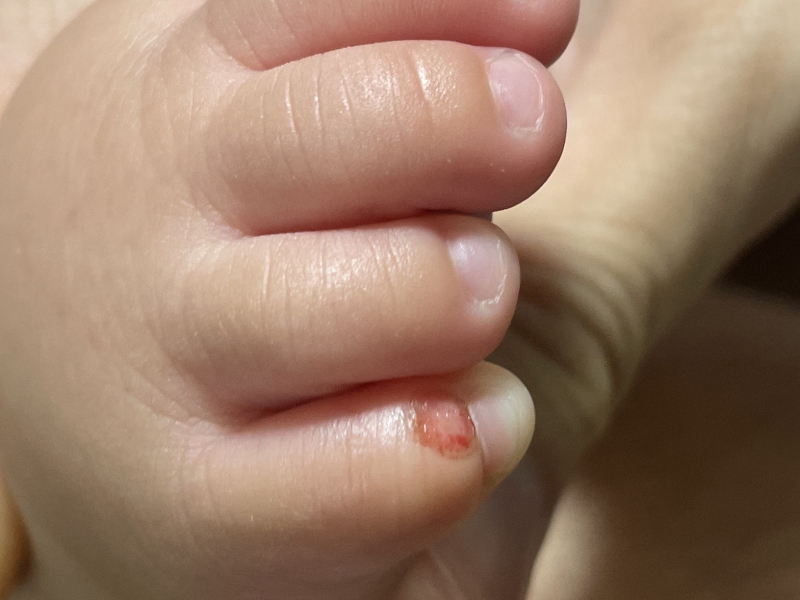 最近ずり這いを練習中なのですが、足の小指に糜爛ができてしまっています。