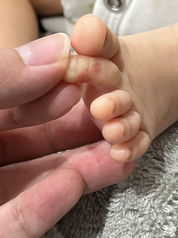 1、2週間前から、気づいたら左の足の指の一本に赤みがあることがわかりました。赤ちゃんが痛がっている様子もないので、知らない間に何かに挟んだりぶつかったりした内出血の跡かな…?と思っていたのですが、なかなか濃い赤みが引かず気になっています。よく見ると、赤みの中心に小さな点々があるような気もしており、このまま様子見するべきか迷っております。