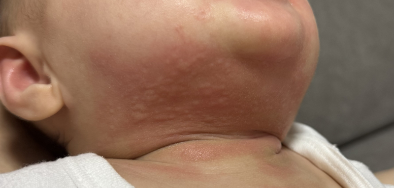 お写真を拝見しましたが、蕁麻疹のようなものも見えますね。
