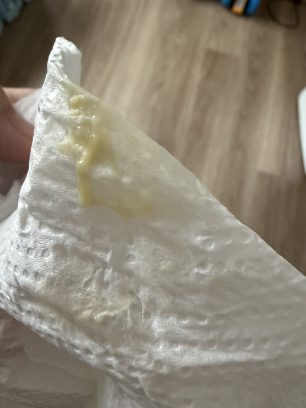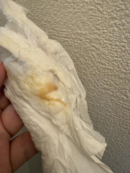 拭き取ると濃い黄色のドロっとした粘り気の強いプルプルしたものがティッシュにつきます。