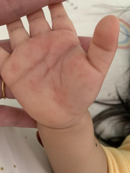 つい先日1歳になったのですが、急に右手のひらにだけ湿疹のような赤いプツプツができてしまいました。