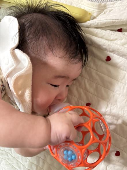 現在生後4ヶ月で、オーボールを握って遊ぶようになったのですが、SNSで、写真のようにオーボールの穴に使い終わった哺乳瓶の乳首をはめると、自分で持ってちゅーちゅー吸えるので、遊べるおもちゃになるというのを見てやっています。