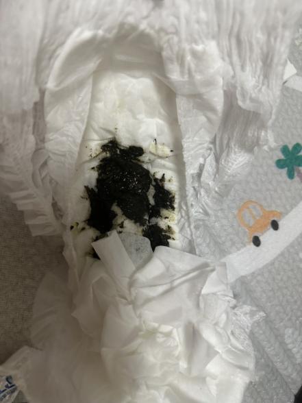 黒色のウンチでご心配なのは、タール便と言われています。タール便はその名の通りタール状のウンチが見られ、この場合には、腸管出血が疑われるので、早急な受診が必要です。タール状のうんちは、光沢があって、海苔の佃煮のようにベトベトしているような性状のウンチを言います。なかなか実際に見たことがないと、分かりにくいかもしれませんが、明らかに全体的に黒く、普段と異なるウンチになると思いますよ。海苔を召し上がったということですが、黒いウンチが続いているということですし、お写真からですと少しタール便のようにもお見受けしますので、一度うんちのついたオムツを持って、早めに小児科でご相談なさってくださいね。