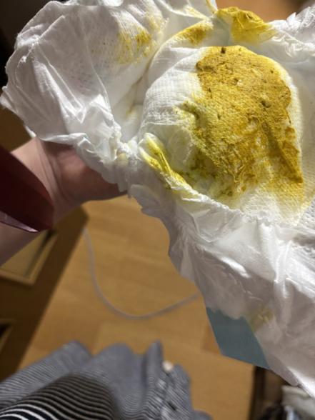 次にお写真のウンチですが、確かに少し白っぽさが混じるような黄色ですが、まだ明らかに黄色ですから、赤ちゃんではよくあります。