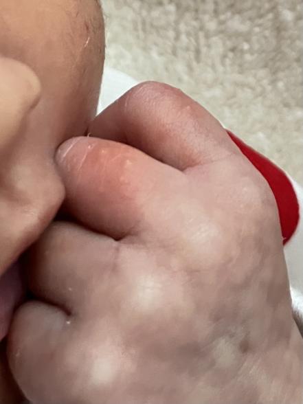 お子さんの指にぶつぶつができていてご心配になりましたね。手の湿疹ということですと、多くは汗の刺激のことが多いのですが、指を吸う癖があるということですと、よだれかぶれのような状態が指に起こっているのかもしれませんね。かもしれません。お子さんの場合には、まだお肌が薄くデリケートなので、少しの刺激で荒れてしまうこともあります。こまめに清潔に洗っていただいて、ワセリンなどで保護なさるといいかもしれませんね。ワセリンはお口に入っても問題ないと言われていますので、舐める前に保護していただくと少しは刺激の軽減になるかもしれませんね。もし、どんどん酷くなったり、広がってくる場合には、小児科か皮膚科でご相談くださいね。