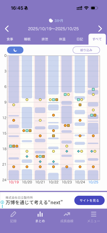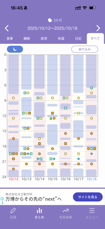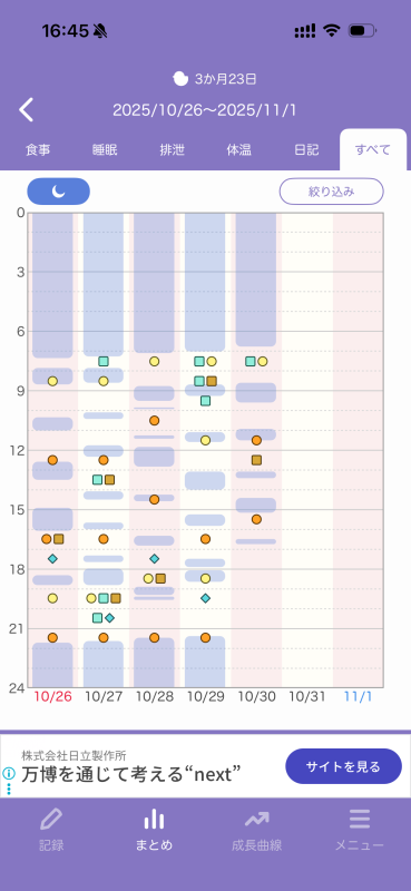 2週間前(写真1枚目)から最後のミルクの時間を9時すぎに固定をし、