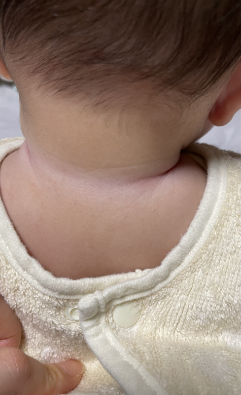 お写真のように首のところなどは、皮膚が重なりやすく、白っぽく見えることがあると思います。それに比べると、他のお肌が黄色っぽく見えることがあるかもしれませんが、日焼けや日常のさまざまな刺激などによって、お肌の色は少しずつ変化してくることも多いですよ。皮膚が重なり合っているところは、外部からの刺激を受けにくいので、色のコントラストがついて、気になることもあるかもしれませんが、黄疸など病的な場合には、皮膚の色だけではなく、哺乳量が減ったり、活気がなくなってしまったりすることもあると思います。他に気になることがないのでしたら、あまりご心配なさらなくてもいいように思いますよ。