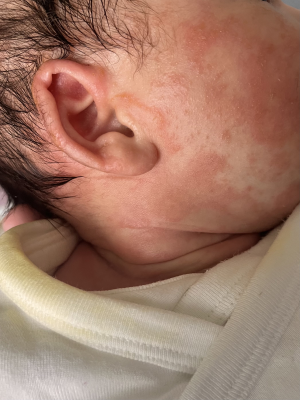 生後1か月4日の赤ちゃんなんですが、顔から首にかけて赤く乾燥していて、耳には黄色いカサカサができています。 1か月健診では「泡でよく洗って保湿すれば良くなる」と言われたんですが、そのときよりも赤み、乾燥が強くなった気がします。 洗い方や保湿の仕方はこのままで大丈夫でしょうか?それとも受診したほうがいいですか?