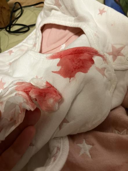 生後5ヶ月ですが、吐き戻しがまだあり、最近また増えてきています。(授乳回数の半数ぐらい。量はそこまで多くありません)今日の朝、授乳1時間後に血が混じった唾液を吐きました。(昨日の吐き戻しのミルクの中にも1ミリにも満たない赤色は見られました。)搾乳時、痛くて乳に血が混ざっていたので、乳頭は切れてそうです。拭いても血はつかなかったため、授乳時に血が出てるかはわかりません。また便はドロっとしたのがありました。それ以外は変わった様子がありません。病院受診するべきでしょうか?