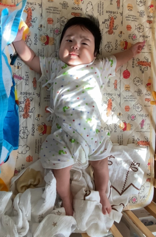 手足の存在にこれから気づいていき、意思を持って動かすようになるのはその後からになります。