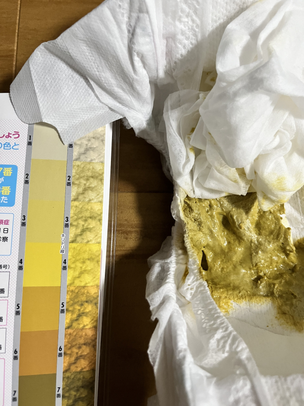 現在あと数日で生後4ヶ月になる息子がいますが、普段は回数は1日1〜2回で、混合のため黄色か若干緑のやわらかめのウンチ(ウンチカラーカードの4番)なのですが、昨日より少しミルク抹茶のような少し白みがかったような黄緑のウンチ(カードの3番に見える)が出ています。