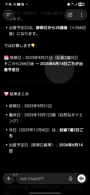 6週5日で初診した時も5週2日相当で小さめだったので週数が気になりChatGPTで相談してみると現在7週4日相当で妥当な週数との事でしたが、アプリなどで排卵日から週数を計算出来る物を利用すると8週1日で最終月経日での計算と数日しか違いません。
