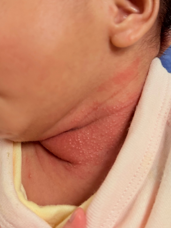 生後13日の新生児の首に湿疹?あせも?のようなものが見られます。