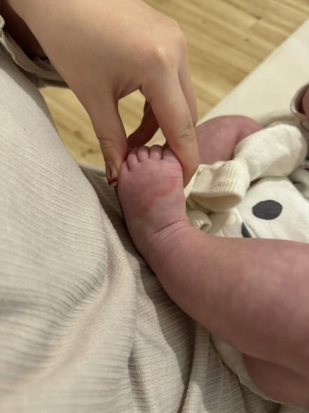 生後4か月の男の子です。両足に赤い線状の模様ができて3週間ほどたちます。本人は機嫌良く毎日過ごしておりますが受診は必要でしょうか。