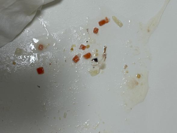 そうですね。おっしゃる通り、痰のような分泌物に混じり、出血の後のような赤黒い感じがありますね。