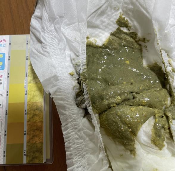 うんちの色が緑がかった灰色で、実物は写真よりもう少し灰色っぽいです。