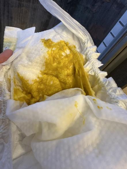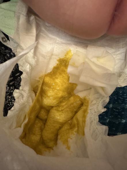 現在生後2.5ヶ月で完母で育てています。1度目のワクチンは終わっています。赤ちゃんの便の色についてですがミルクを飲んでいる赤ちゃんは固まってきたり色も茶色に近付いていると聞いてうちの子の便は大丈夫かと心配になりました。私が見たところ白っぽかったり、黄疸があるようには見えないのですが、便の色が茶色ではないので心配で、、、画像添付するので健康な便かどうか見ていただければ幸いです。1枚目は暖色系の室内光の下、2枚目は夕方の自然光の下の写真です。