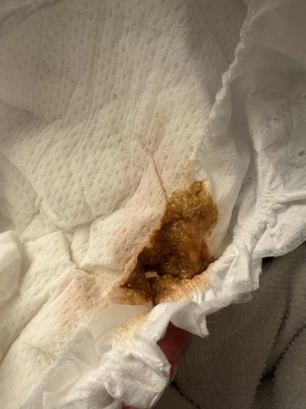 4日ほど前からミルクの量を増やした関係か、新生児以降は1日1回程のうんちが2-3回に増えてきました。そのせいなのか、3日前からうんちに血が混じるようになりました。最初は糸状の血が少し混じっていたのですが、今日のうんちは全体的にほんのり赤くなっていてびっくりしてしまいました。