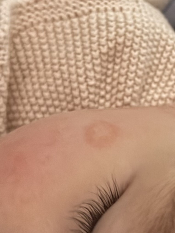 最近写真のような丸い湿疹のようなものが出ます。消えたり出てきたりを繰り返し、同じ場所だけでなく違う場所にも出たりします。これは気にしなくていいものなのでしょうか?離乳食が原因ですか?