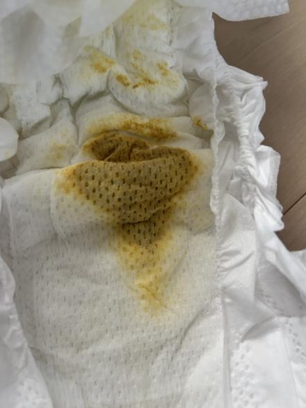 ここ2日うんちが出ていなかったのですが今日うんちをしたと思ったらオムツに全て吸収されているものが出ていました。匂いもいつもとは違うようなにおいがしました。おしりを拭くと黄色なのですが、添付した画像のように中心が焦茶色のような色をしています。