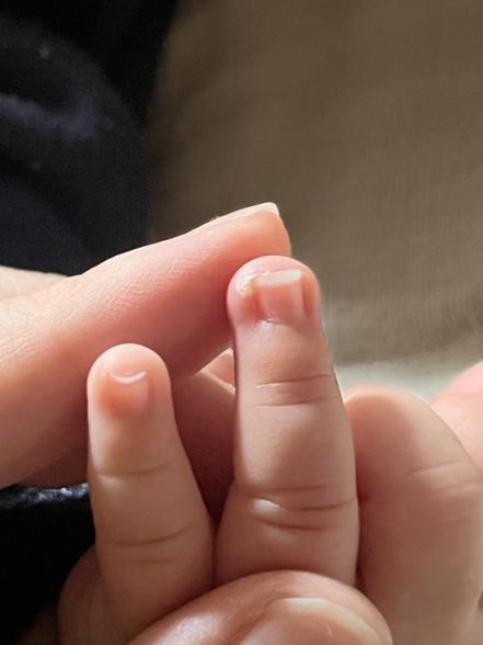 お写真を拝見する限りですと、赤く腫れていたり、炎症を起こしているわけではなさそうなので、もしかすると、指しゃぶりなどの刺激で、指の一部が固くなってしまうこともあると思います。お子さんが痛がったり、気にしたりすることがなければ、やすりで爪の角を削っていただいて、ご様子を見ていただいて良いと思いますが、もし爪の周りが赤く炎症を起こしたり、爪のケアがなかなかうまくいかないようであれば、一度皮膚科でご相談なさってくださいね。