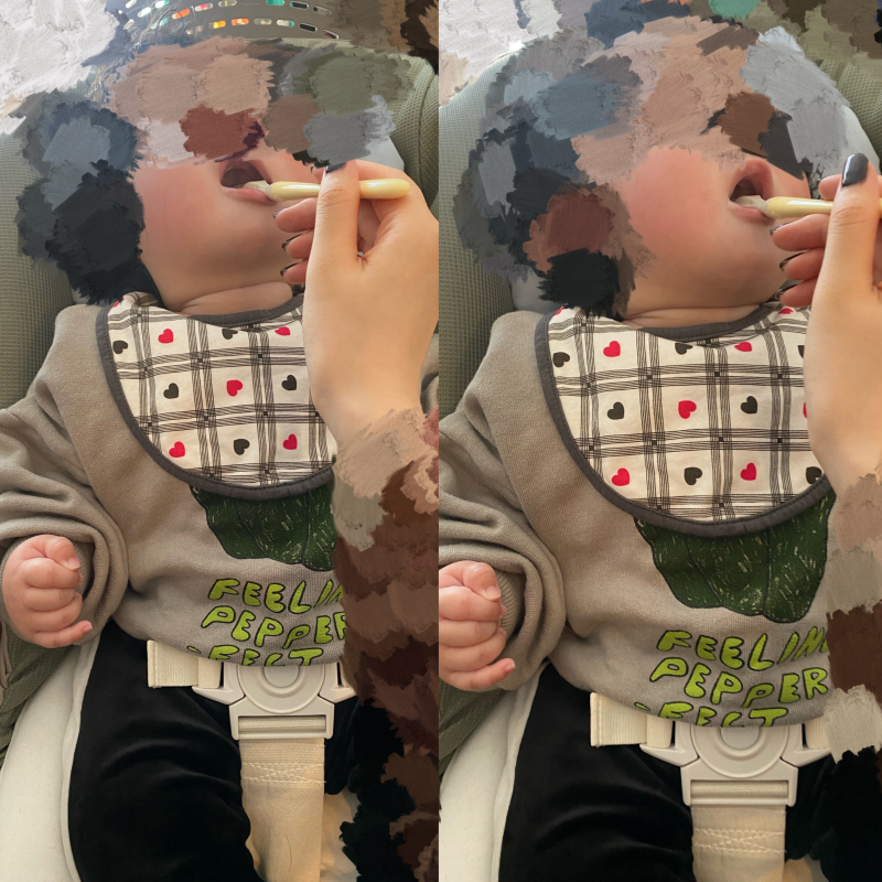スプーンを奥まではいれたり、上顎になすりつけるように食べさせるのは丸呑みの癖がつきやすくなるのでNGです。