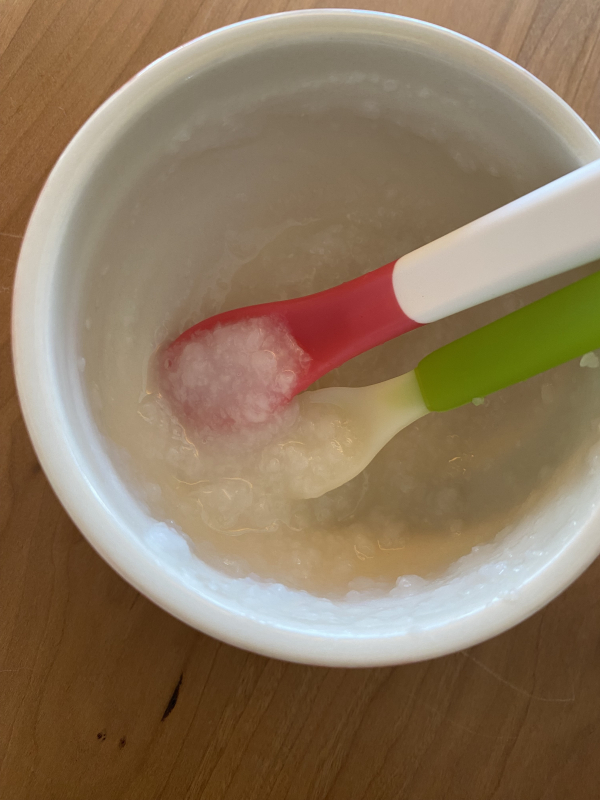 10倍がゆを潰して少しお湯を足して食べさせましたが、硬さはこのくらいで良いのでしょうか?