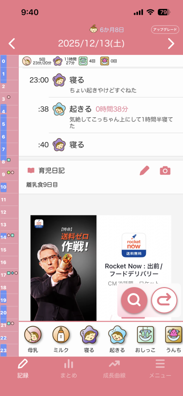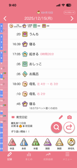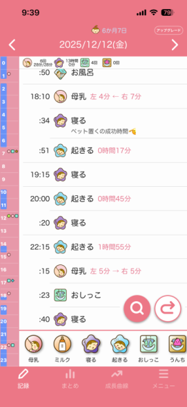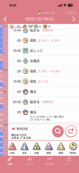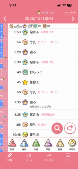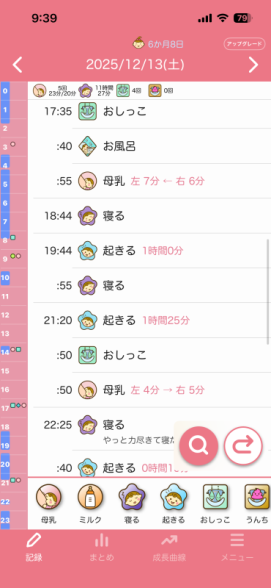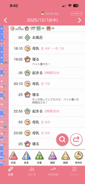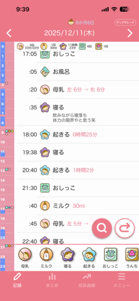 でもそれを聞いて8日前から、チャットGPTと相談しながら、今まで昼寝夕寝好きなだけさせてましたし、夜の寝かしつけも決まった時間ではなく遅めの時間だったと反省し、昼寝夕寝を短めにしたり、17:40分頃お風呂に入れて、お風呂に入れた後はそのまま寝室に行き授乳、1回覚醒しますが、寝室のまま過ごして19時ごろ就寝というのに整え始めました。