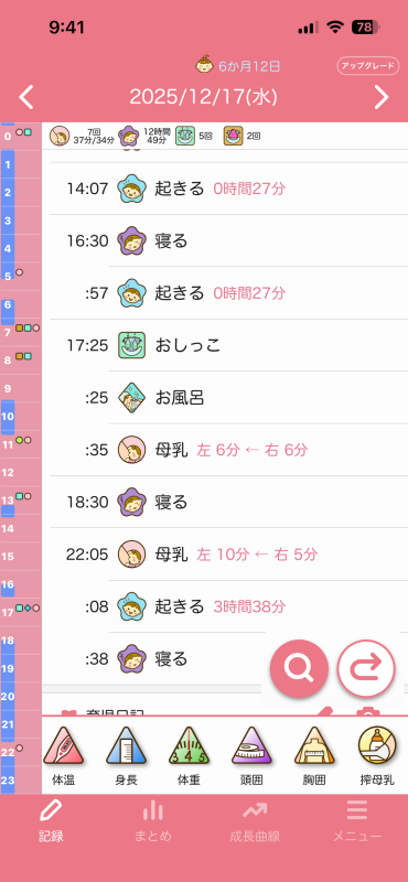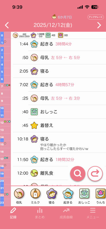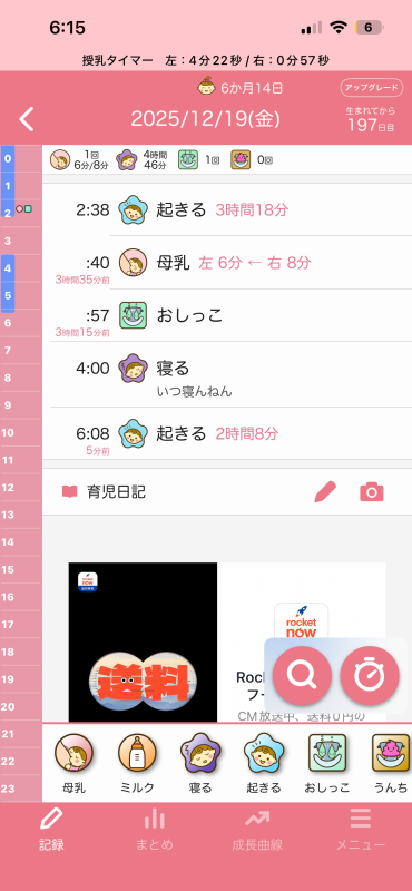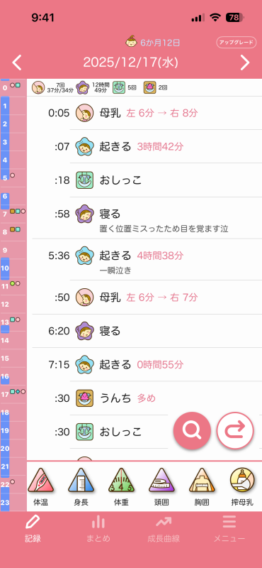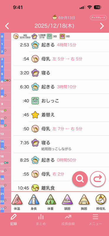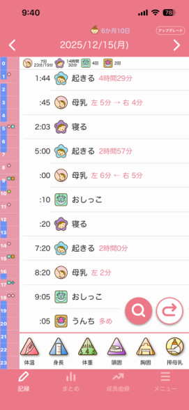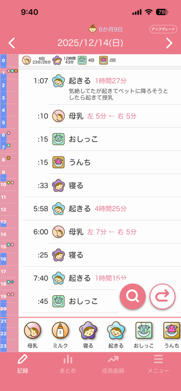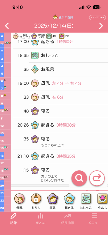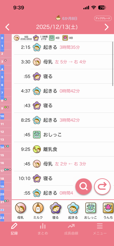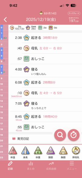 ちなみに夜の授乳時間は寝落ちするのでもっと長いのですが、口は動いてるけどゴクゴクって感じではなく、時間はゴクゴクと飲んでた時間を記録した方がいいのかと思って記録しておりました。