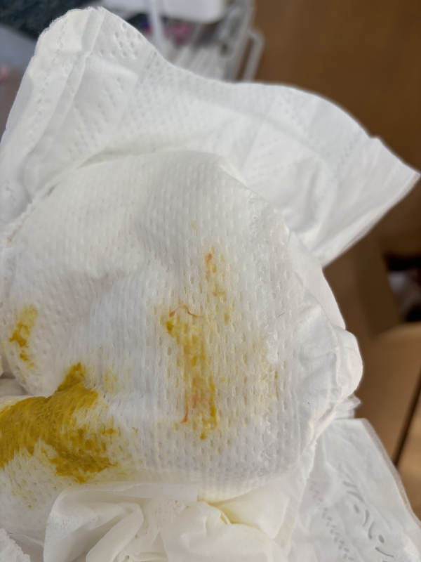 新生児の赤ちゃんらしく、ちょこちょことうんちをしている様子でもあるので、肛門近くで摩擦によりお傷ができて出血が少量うんちに混ざって出てきていたのかなと思いました。