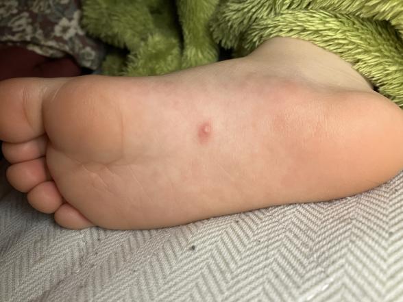 2ヶ月ほど前に足の裏にポツっと虫刺されのようなものができました。痒がったりすることや触っても痛がったりする様子もなく、本人も気にしていないようですが、一向に消える気配がありません。ちゃんと病院で診てもらった方が良いでしょうか?