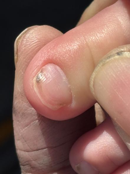 3ヶ月の赤ちゃんなんですが、足の親指の爪の中にゴミっぽいのが以前から入っていて、爪が伸びれば自然に出てくると思っていたのですが、何もとろうともしていないのに、前より奥に少し進んでいて、ゴミっぽいのも前より大きくなってます。皮膚科に行きましたが、無理に取ろうとしたら爪が浮くとのことで何もしないで終わりました。
