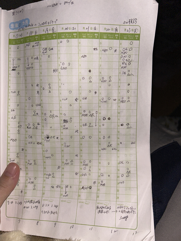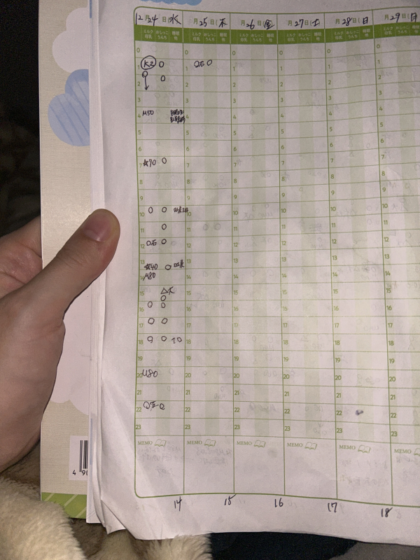 授乳中、一度は満足そうに乳首から口を離し眠りそうな感じなのでしばらく抱っこしてから寝かせるのですが、ベッドに寝かせるとしばらくして乳首を探すそぶりを見せて、様子見していると癇癪泣きを起こすこともあります。今日は14〜22時くらいまでまとまった睡眠を取らず、ずっと浅い眠りの様な感じで口をぱくぱく、手足バタバタとしていました。