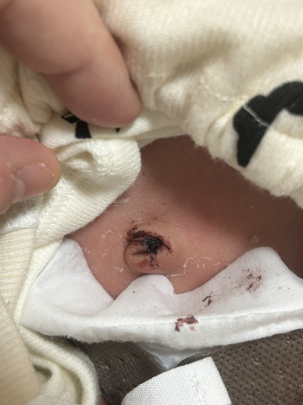 ①生後3日で臍の緒が取れました。その後退院して6日目血が出る様になりかさぶたができました。