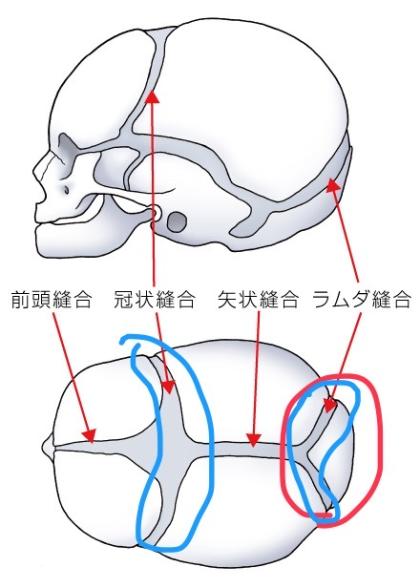 ↑のラムダ縫合の段差が大きく目立つようになるので、おそらく抱っこした時の腕の圧力で若干赤枠部分の頭蓋骨が内側に動いてしまっているのかと、、、