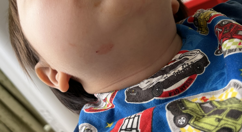 息子さんの顎下の赤い跡についてですね。