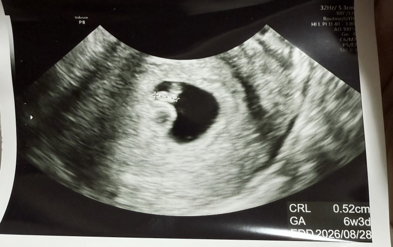 6w6の時に6w3に相当する大きさの胎芽と心拍が確認できました。排卵日がずれていたので、このずれはあまり気にしていませんが、10日ほど前に胎嚢と卵黄嚢のみの確認の際に見えていなかった、膜に包まれた空間?も一緒に確認されました。血流はないようなのでふたごの可能性は低いです、