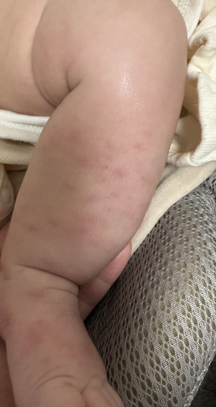 今日の17時の沐浴時にはなかったのですが、19時ごろオムツを替えようとした時に左足にだけ赤い湿疹ができていることに気づきました。こちらは乳児湿疹でしょうか??他に考えられるものはありますでしょうか。