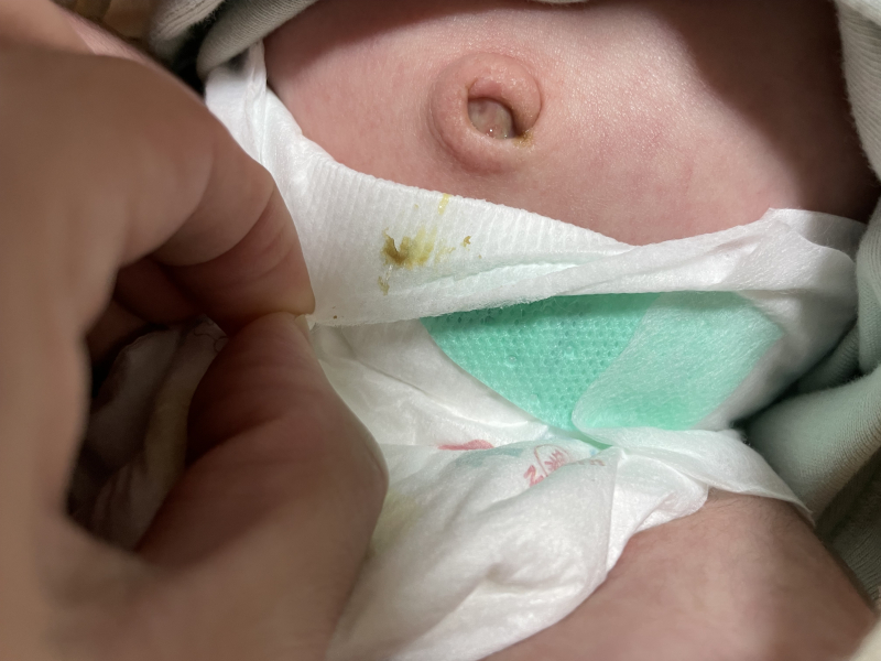 生後15日です。へその緒が取れたんですが周りが少し腫れてるような感じで。。オムツにも黄色いしる?みたいなのがつきます。まだ取れて2日目とかなので様子見でいいのか受信した方がいいのか聞きたいです。