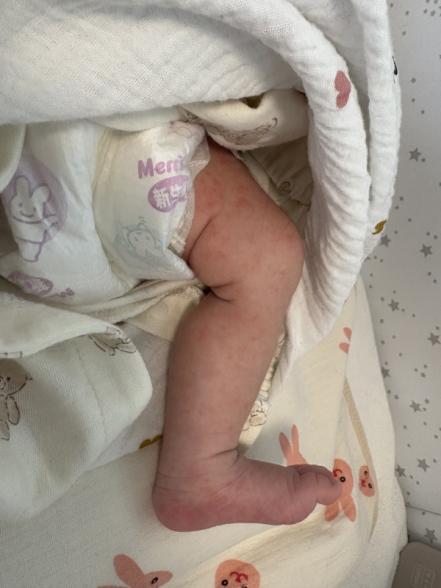 生後3週間なのですが、足全体的に発疹が出てきてたようなのですが、蕁麻疹??でしょうか?