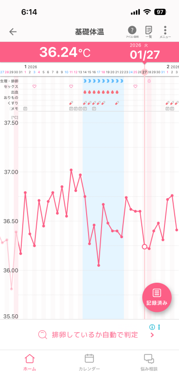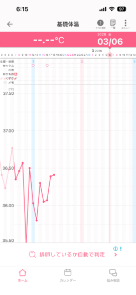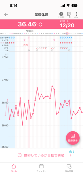 基礎体温のガタガタさはありますが、高温期、月経期と分かります。