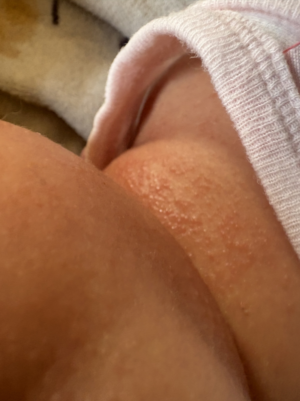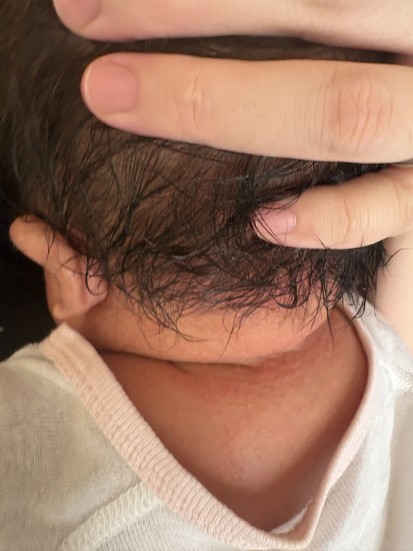赤ちゃんの首周りに赤い小さな丘疹がありますね。