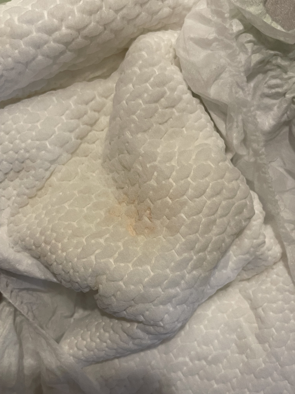今日オムツ替えの際、オムツのおしっこ部分に薄い赤いシミ?みたいなものが付着していました。