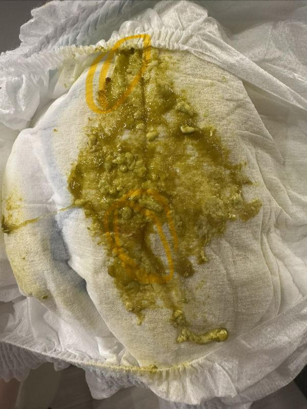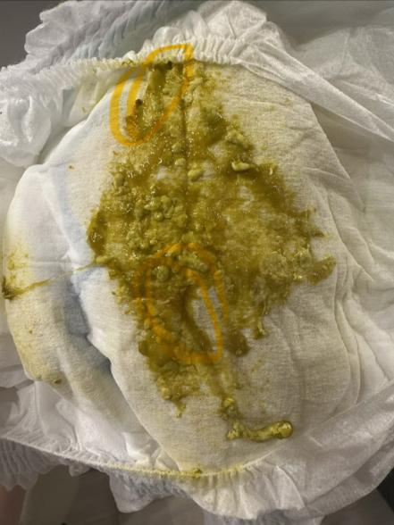 母乳性血便は、おっぱいのお子さんには比較的よく見られる症状ですよ。また、鮮血の場合には、多くは消化管出血などを疑うものではなく、肛門など、お尻からの出血が付着した可能性もあります。例えば、お写真のようなゆるめのウンチが続いていて肛門に負担がかかっていたり、頻回な排便で切れ痔のような状態であったりすると、ウンチに血が混じることもありますよ。